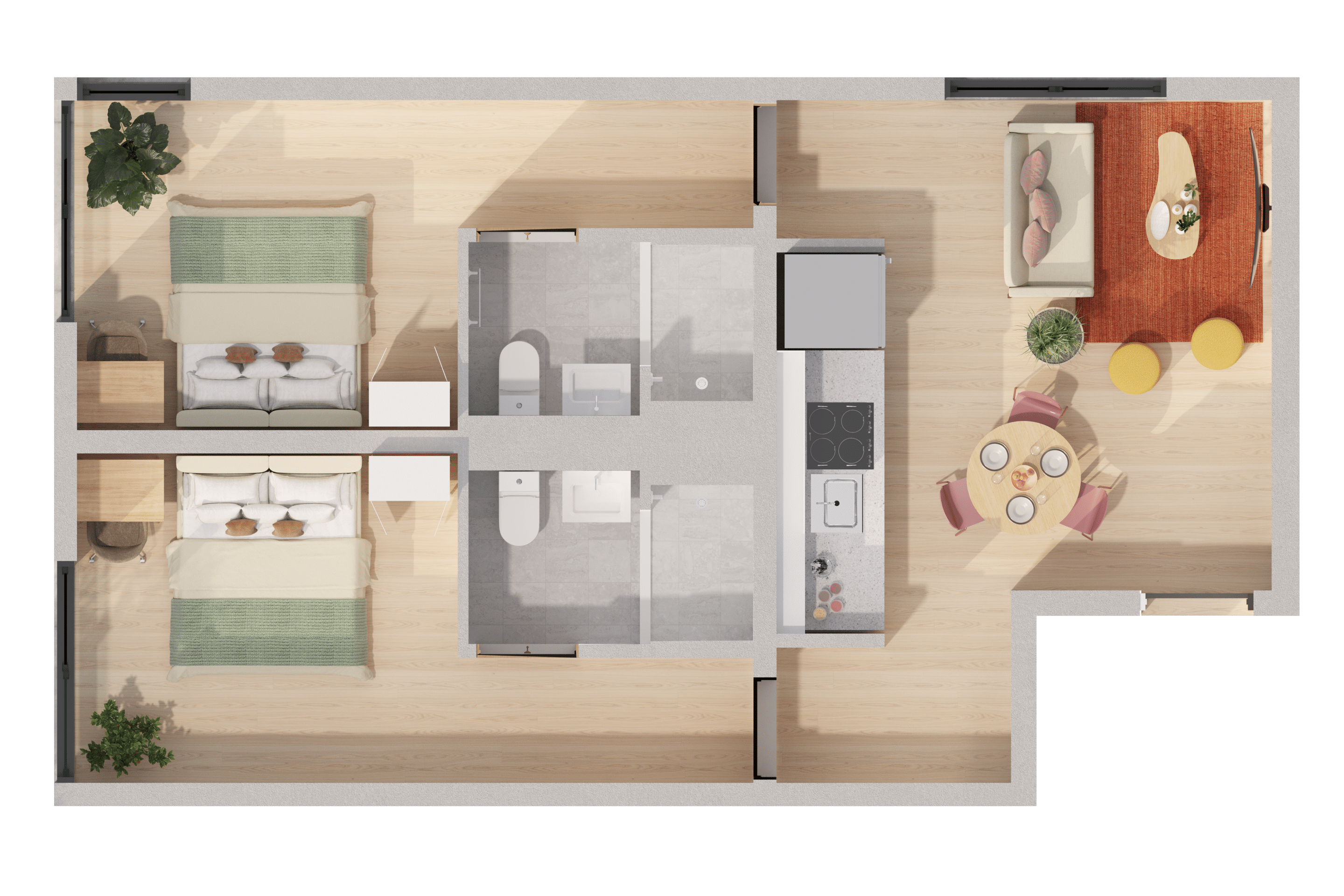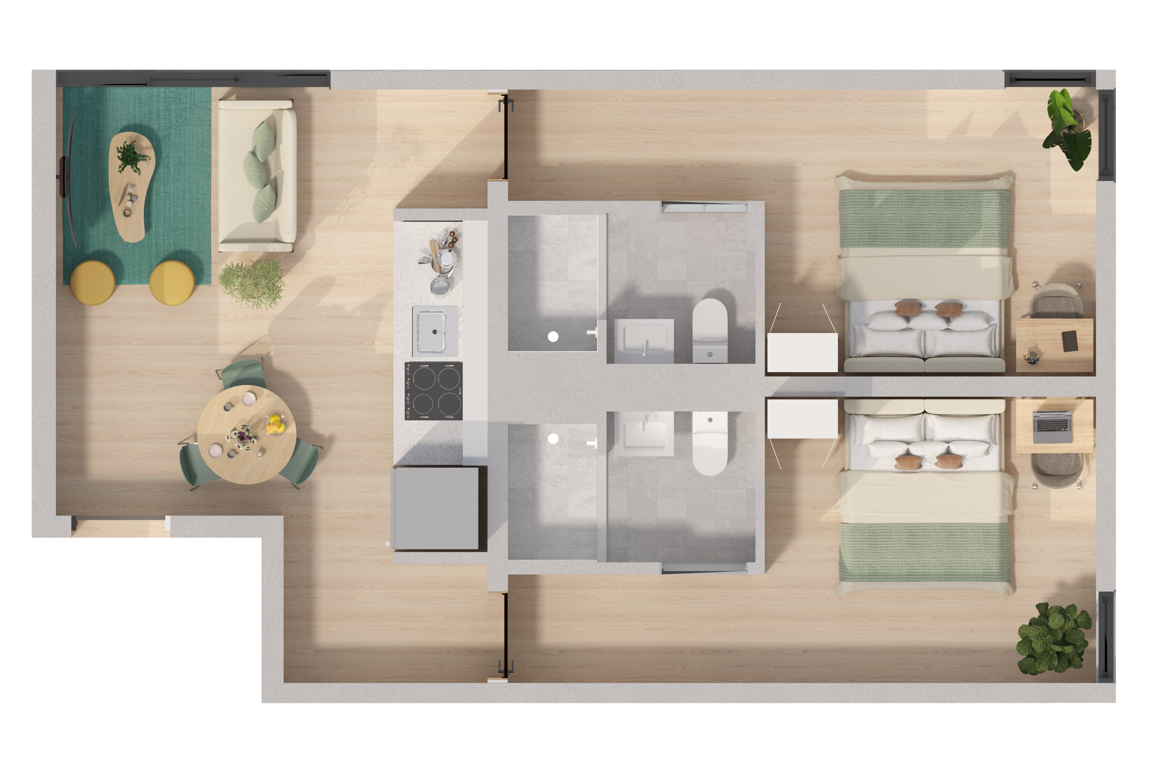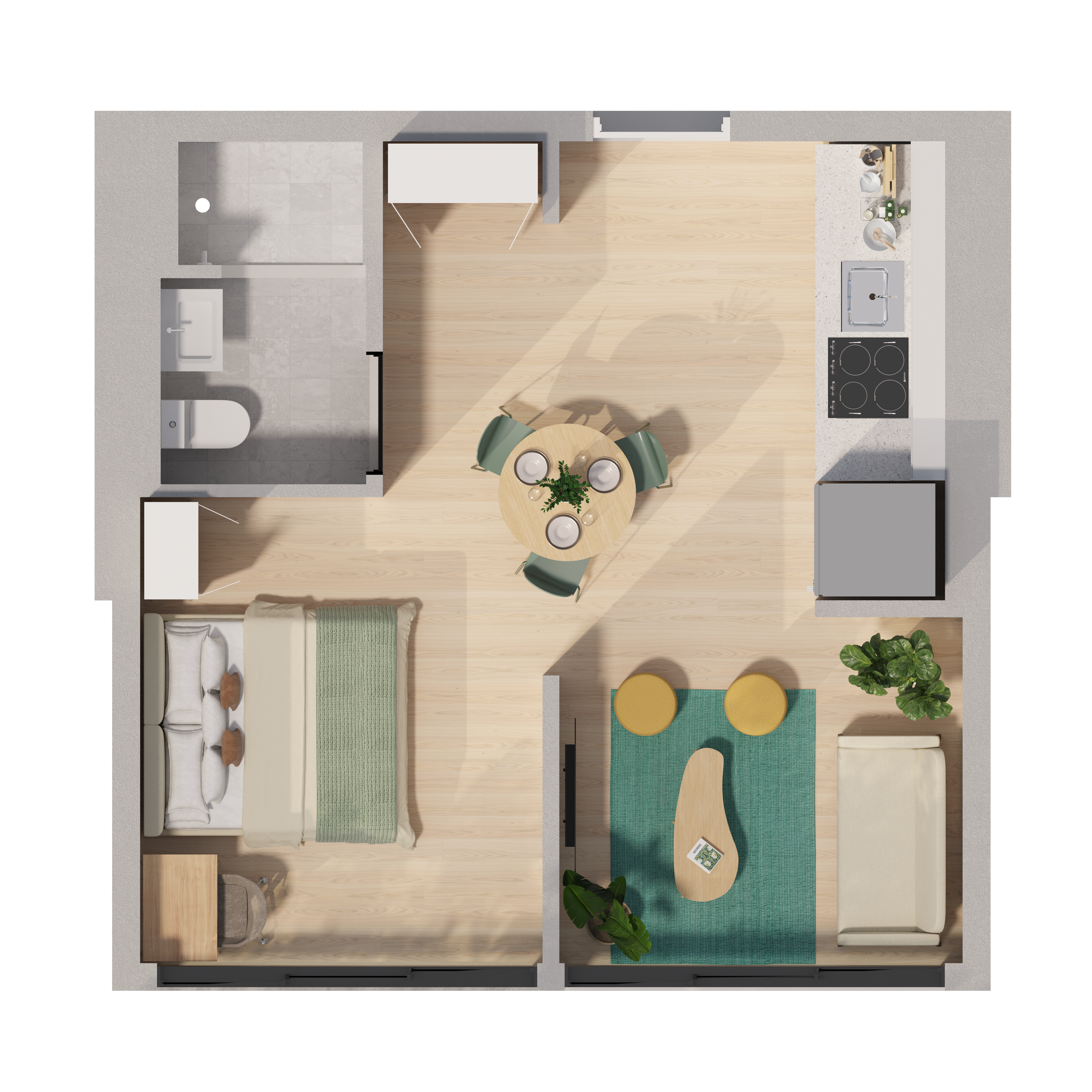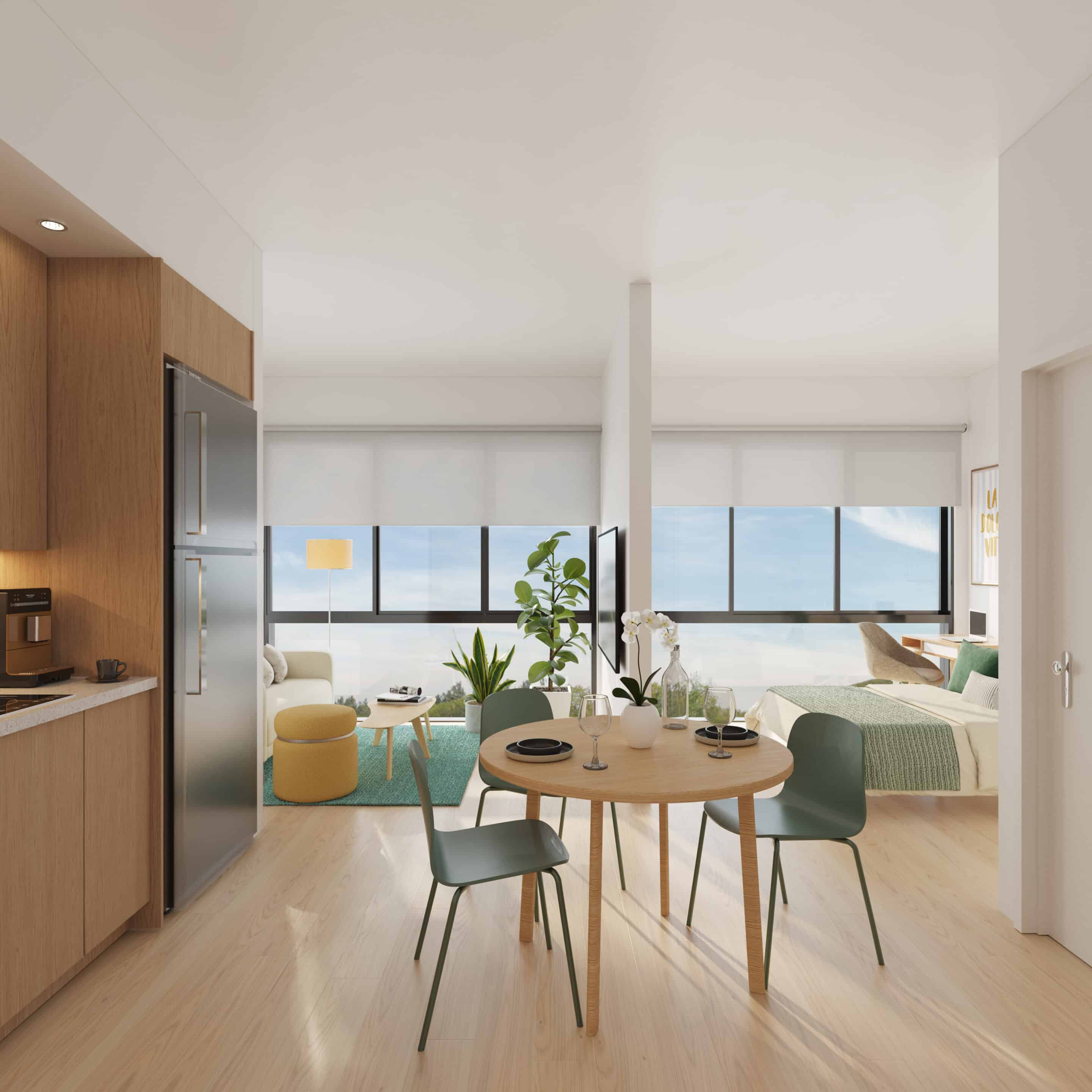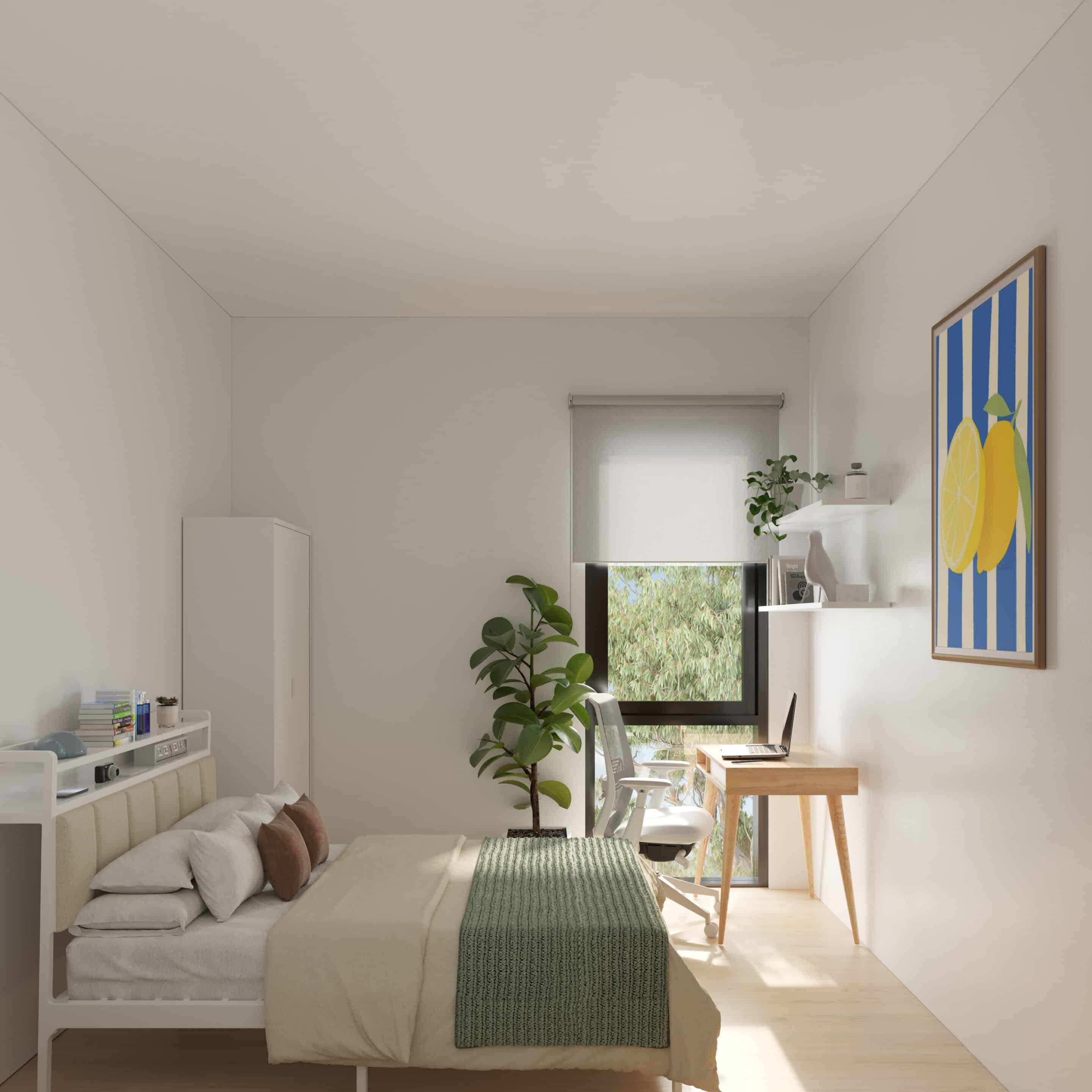 Own your private bedroom and en-suite bathroom in a shared apartment designed for modern urban living. Each residence comes fully furnished with thoughtfully designed kitchens and shared living spaces, perfect for remote work, socializing, or relaxing.